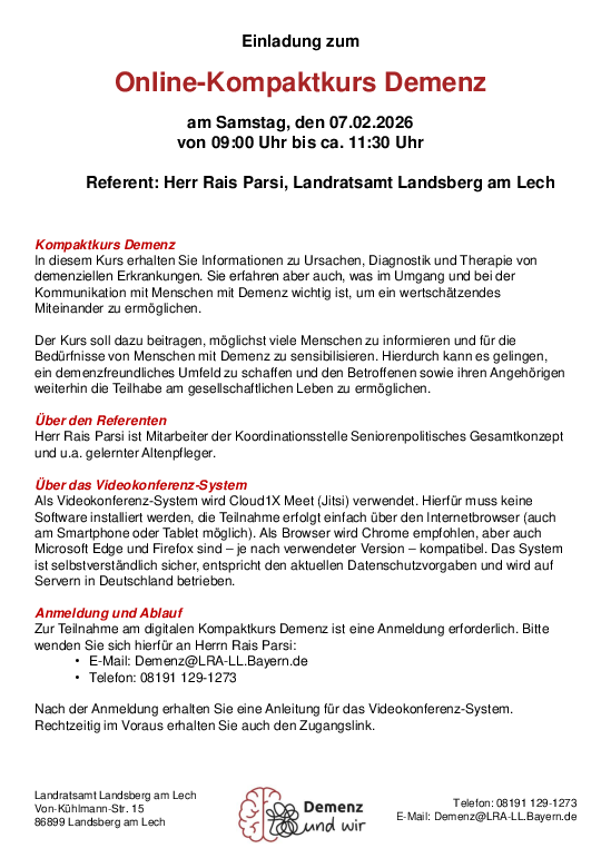 Am Samstag, den 07.02.2026 findet von 09:00 Uhr bis ca. 11:30 Uhr ein weiterer Online-Kompaktkurs Demenz statt. In diesem Vortrag werden die wichtigsten Informationen zum Krankheitsbild, u.a. Ursachen, Risikofaktoren, Verlauf sowie Diagnose und Therapie, vermittelt. Darüber hinaus wird erläutert, was im Umgang und bei der Kommunikation mit Menschen mit Demenz wichtig ist, um ein wertschätzendes Miteinander zu ermöglichen.